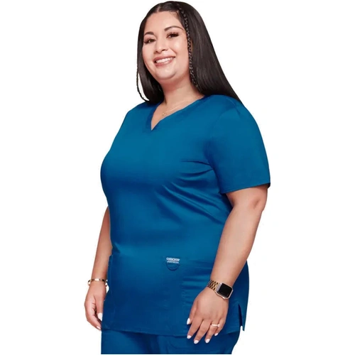 A v-neck top with shirttail hem elevates this style beyond a basic v-neck. There are a total of three pockets with reverse hem trim: a chest patch pocket and two roomy patch pockets. Decorative tonal topstitching adds the finishing touch to this scrub top. Modern Classic fit. Center back length: 26"